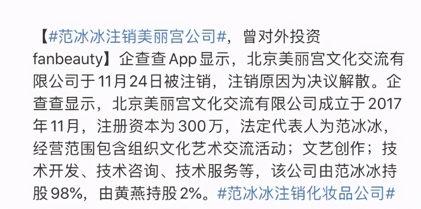 前不久,范冰冰被曝光注销了旗下一家公司,虽然只是注册资本为300万的公司,但这应该只是范冰冰产业集团萧条的开始,未来对于范冰冰的财富布局应该还有更多挑战和困难。