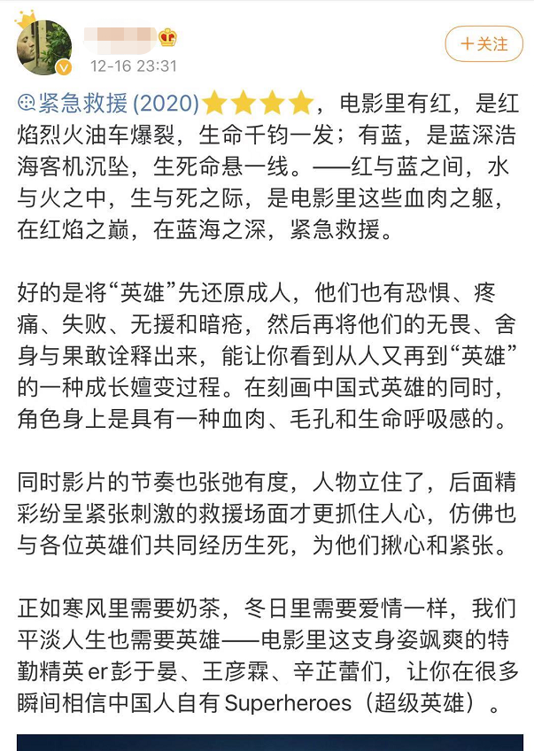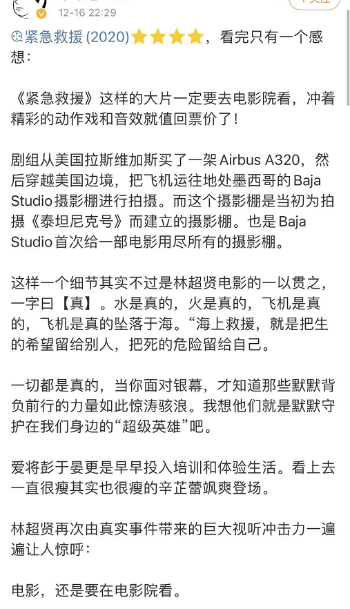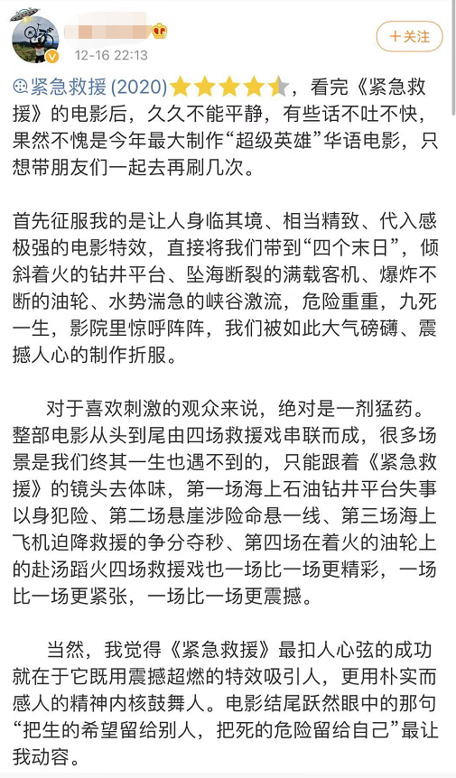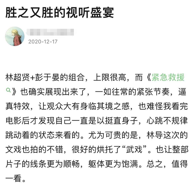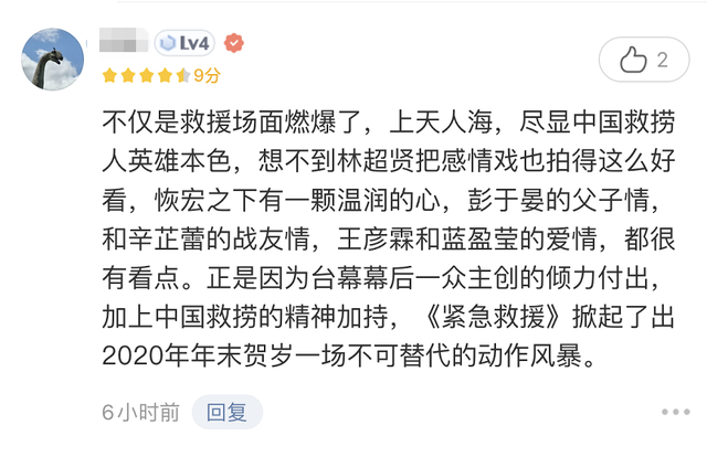 也有网友很认真地写了长长的评论,他认为《紧急救援》是一部重工业电影,大场面很多令人印象深刻,如果要全方位评价,自然是“武戏足够强,文戏也不弱!”