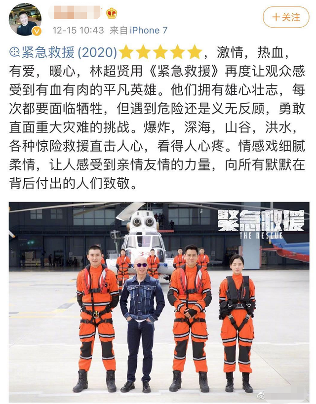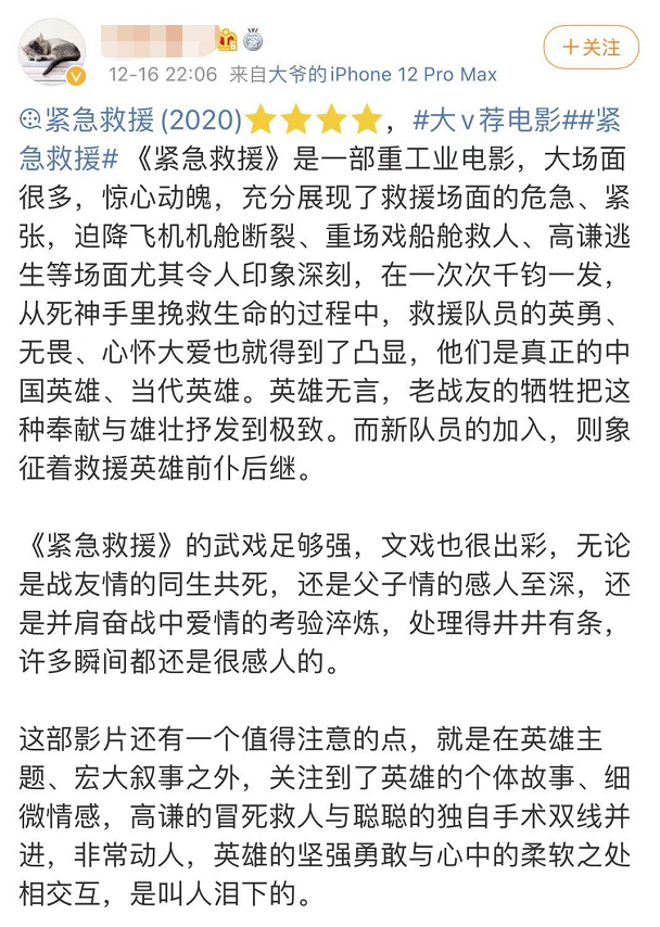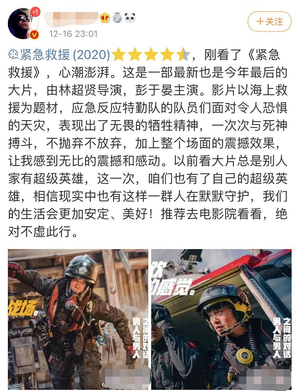 微博中有很多大V已经看完整部电影,对《紧急救援》的评价都很高,基本全是四星五星。