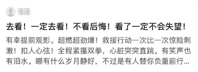 也有微博网友表示,自己虽然看了点映,但之后一定要和朋友再刷一次,因为不仅“电影特效让人身临其境,相当精致,代入感极强”,而且“精神内核朴实无华,很鼓舞人。”