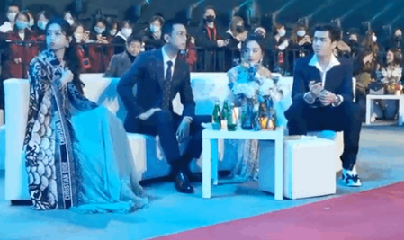 所以赵丽颖李现杨幂吴亦凡被安排在一张长凳就坐,赵丽颖杨幂的风格反差对比就太明显了。赵丽颖除了简单打招呼友好碰面,大部分时间都很安静认真观礼。而杨幂这左边吴亦凡,右边李现,两大帅哥围绕,难免心花怒放。