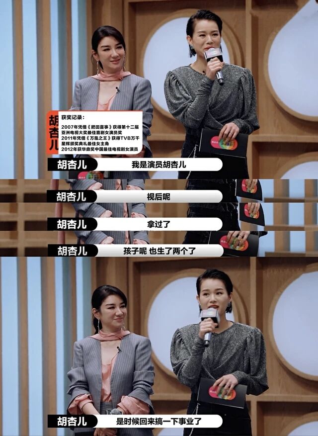 比如结婚之后这怀孕生娃的四年,胡杏儿不仅拍了电视剧《那年花开月正圆》《熟女强人》,还拍了两部电影,而且还参加了《跨界歌王》和《演员请就位2》。虽然演艺事业不如从前风光辉煌,但保证了不从影视圈消失,而参加的综艺节目和娱乐圈活动,也是为了在中年怀孕生娃之后不完全过气。