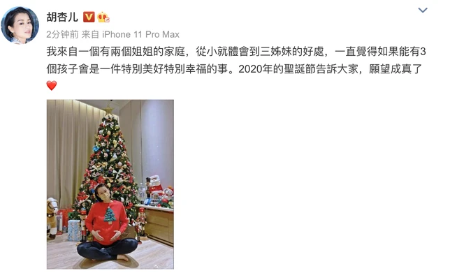 2017年10月13日,胡杏儿在微博宣布生下宝宝 。2019年7月6日,胡杏儿宣布二胎出生喜讯,还透露二胎儿子的姓名叫“李奕霖” 。2020年12月25日,胡杏儿在微博官宣怀三胎。看看胡杏儿这三胎之间,间隔都没超过两年,可以说胡杏儿战斗力真的太强,不愧是身材魁梧个子大好生养。