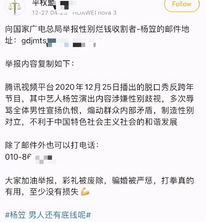 但人红是非多,杨笠此番言论,如果离开了节目的幽默环境,被大肆放大宣传,确实也有些不妥。但是娱乐节目,大家一笑了之就好,杨笠估计本质上并没有那么仇视男人,毕竟她有不少同事好友亲戚都是男人,只不过是站在女性角度发言调侃一下。结果,她就被男网友投诉了,事件迅速发酵,上升到两性的对立和争论了。