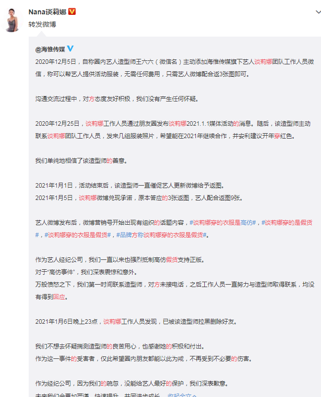但是随后谈莉娜就被吐槽穿的服装是假货高仿,相当尴尬!随后,谈莉娜方面又解释,意思是本人方面不知情,好像是被主动热情的设计师主动设套了!