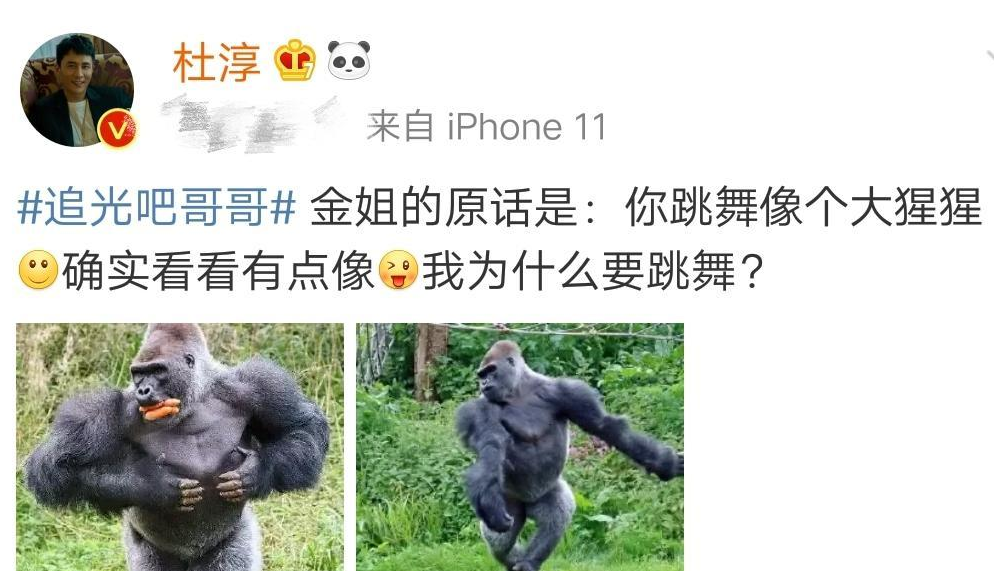 接下来,舞台首秀,几十位哥哥表现油腻或者尴尬,结果偏偏杜淳这个曾经学过舞蹈的演员,跳舞却很机械僵硬,被金星调侃他跳舞像猩猩,随后“杜淳跳舞像猩猩”登上热搜,杜淳还自己配图猩猩自黑调侃,热度不减。