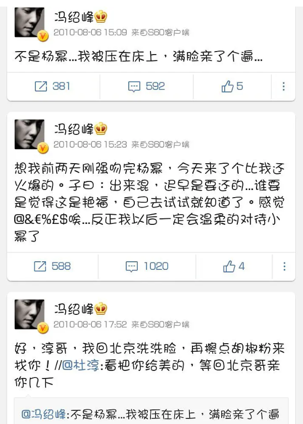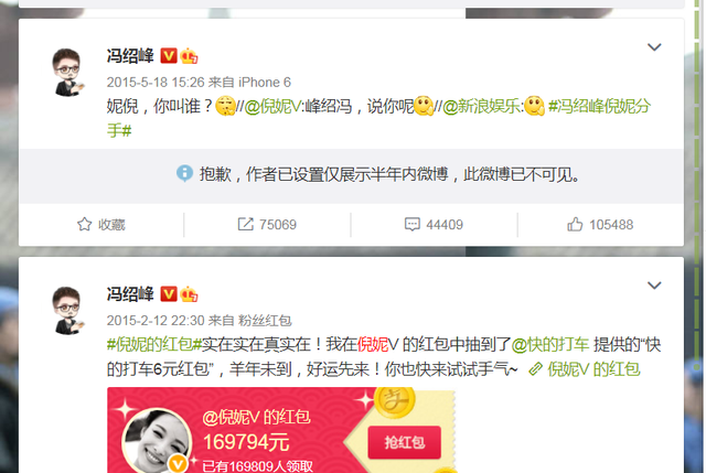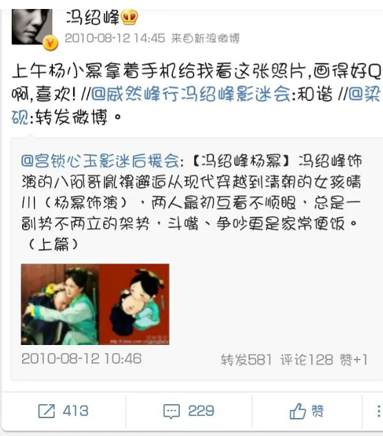 最近,网友在冯绍峰微博搜索,发现居然找不到关于杨幂的只言片语了。但事实上,两人曾经因为合作《宫》,戏里戏外各种互动,在微博上的互动内容,可以说是很甜蜜了。只是没想到过去这么多年了,冯绍峰杨幂各自都恋爱结婚生娃,居然还会刻意处理这些昔日互动的内容。