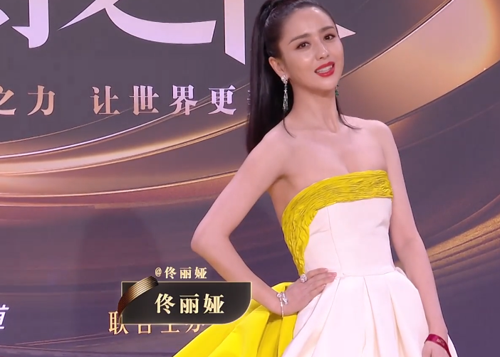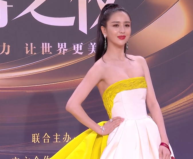 没想到佟丽娅也捕捉到了金黄色流行趋势,只是主色还是白色,突然自己惊艳的美貌更有效,而采用金黄色做抹胸修饰和裙摆,让色彩不单调,增加华丽感,也是很巧妙了。