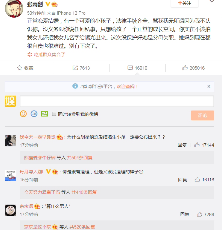 之前传闻已久,张雨剑都没回应,以至于让吴倩和女儿备受争议。这次张雨剑才大方宣布是正常恋爱结婚,有一个可爱的小孩子,法律手续齐全。还怼了相关爆料者和网友,称没义务跟你说任何私事,只想给孩子一个正常的成长空间,实在不该拍我女儿还把我女儿名字给曝光出来。这次没保护好她是父母失职,她妈到现在都很自责也很难过,别有下次了。