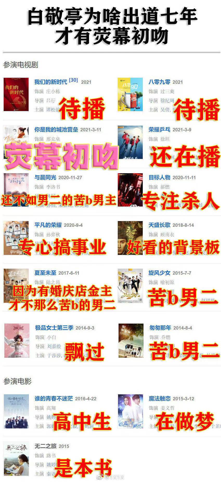 于是有观众和网友调侃,白敬亭这个大帅哥,小鲜肉气质满满,其实早该走红了,却在影视圈打酱油或者不温不火了七年,才逐渐开始走红,而且第一次有了吻戏。于是大家分析了下他之前的几部作品,确实情感戏不够出彩,都没有吻戏,角色存在感弱,魅力展示还不够。