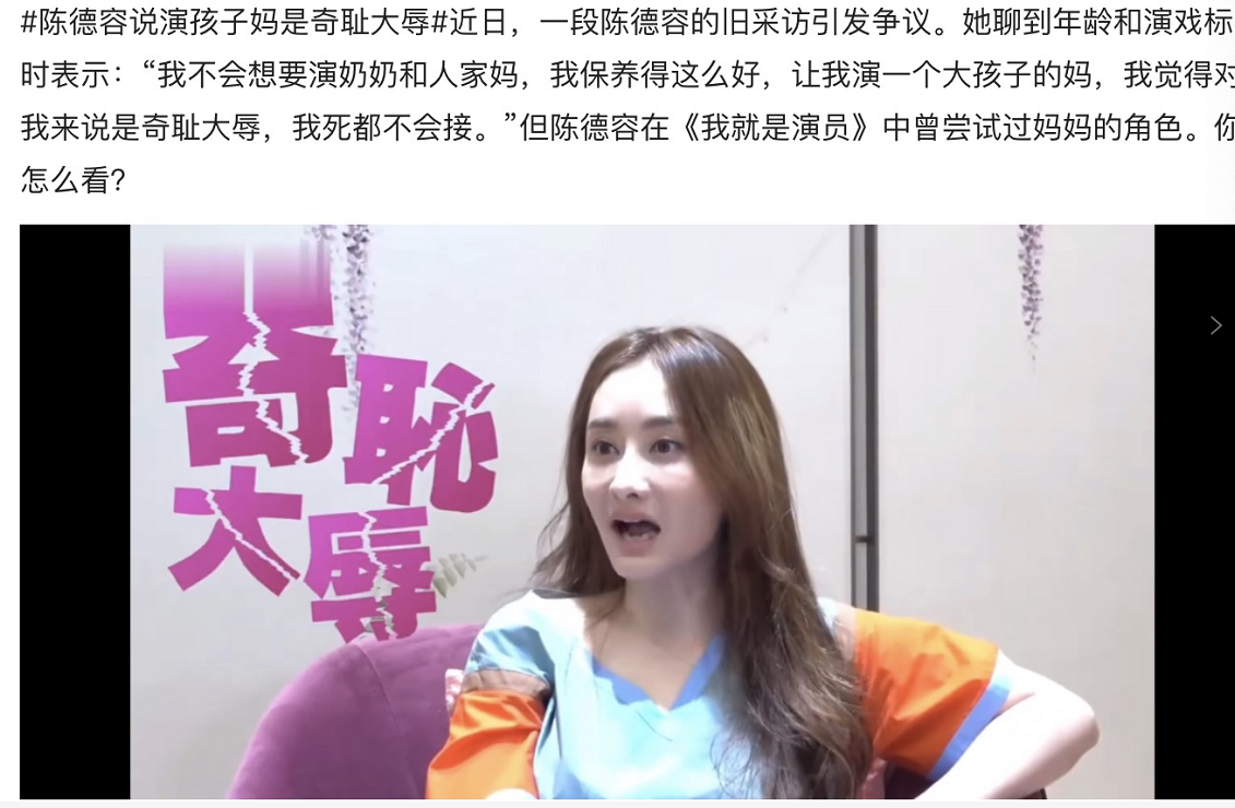 但是陈德容说让她演妈妈是奇耻大辱,这种说法就难免让人质疑非议甚至生气,好像别的演员演妈妈就是理所当然。