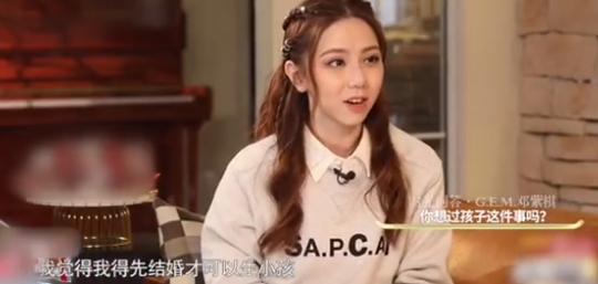 而最近邓紫棋在接受采访时,因为她早已恋情曝光,前绯闻男友林宥嘉早已结婚生儿育女,她也不知不觉到了适婚和怀孕生娃的年龄。但谈到这些问题,邓紫棋个人的观念还是比较正常和传统,她表示自己得先结婚才可以生小孩,透露已想好孩子名字,“女儿叫小橘子,儿子叫小芒果”,还买过婴儿衣服。谈恋爱观,认为感情中两个人旗鼓相当更容易相处,爱情就是不可以太容易得到,结婚在一起也并不是结局,要用一辈子来证明。