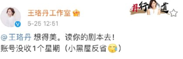 另一方面,工作室也很快做出回应,让王珞丹去看剧本,变相否认了王珞丹退出影视圈,还要没收账号一个星期,看来是不允许王珞丹在网上逗网友,引起不必要的猜测质疑!