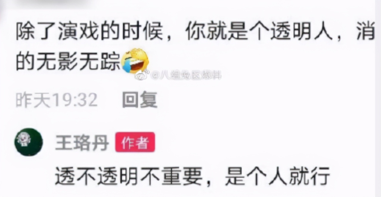 对于这些变化和质疑,王珞丹好像也很淡定,回应网友的话很有意思,比如管它透不透明,是个人就行!还回应网友的退圈质疑说自己退圈了!