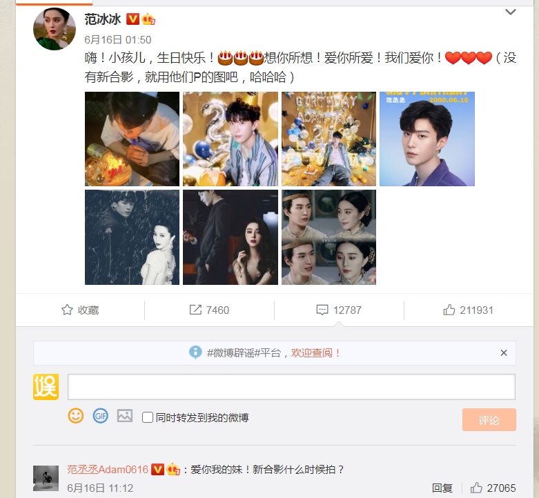 最近,范丞丞迎来21岁生日,诸多娱乐圈明星好友和粉丝争相评论送祝福,姐姐范冰冰也不例外,而且是要单独发文晒照送祝福的,这个待遇肯定不一样。但是范冰冰却没有和范丞丞的新合影,只能用别人P的合影代替。