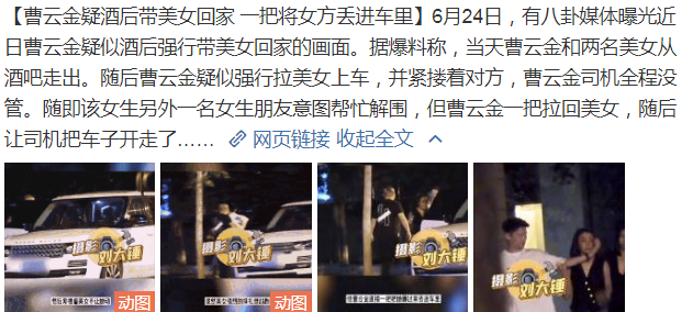 最近,有八卦媒体曝光曹云金疑似酒后强行带美女回家的画面。据爆料称,当天曹云金和两名美女从酒吧走出。随后曹云金疑似强行拉美女上车,并紧搂着对方,曹云金司机全程没管。随即该女生另外一名女生朋友意图帮忙解围,但曹云金一把拉回美女,随后让司机把车子开走了。从画面看,确实显得很粗暴野蛮,随后引来网友很多质疑非议。