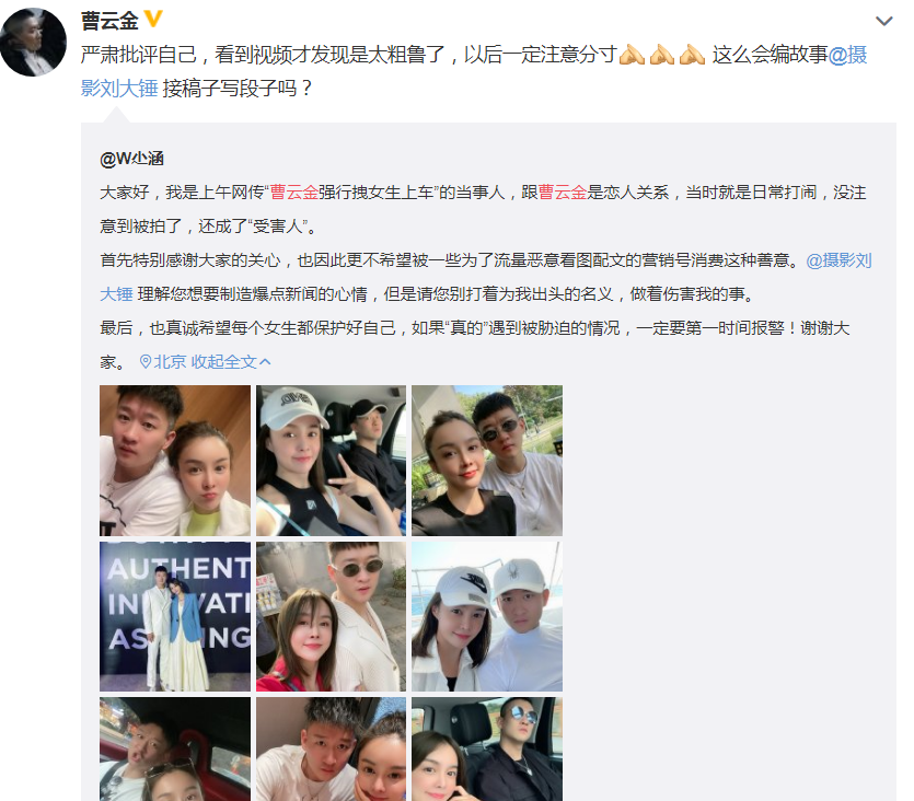很快,视频中的女主角在网上回应,称自己是网传“曹云金强行拽女生上车”的当事人,跟曹云金是恋人关系,当时就是日常打闹,没注意到被拍了,还成了“受害人”。感谢大家的关心,也因此更不希望被一些为了流量恶意看图配文的营销号消费这种善意。