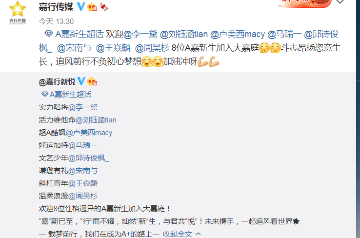 而且这次嘉行签约新人也不止一个,而是一批,多达八个,还为每个人准备了标签,分别是实力唱将李一黛、活力维他命刘钰涵、超A酷飒卢美西、好运加持马瑞一、文艺少年邱诗俊枫、谦逊有礼宋南与、斜杠青年王焱麟、温柔浪漫周昊杉。看来都是各有特点,虽然有些标签可有可无,有点生硬尴尬,但应该是有长处,才能被嘉行相中。