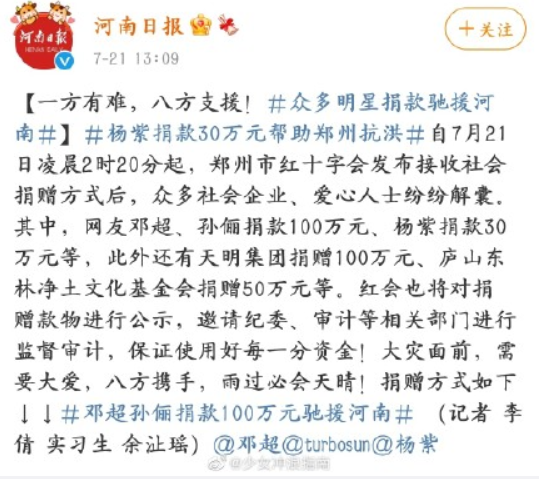 最近,罕见的夏季洪水席卷河南省,郑州等地遭遇特大水灾,灾情严重。一向给人感觉有些浮躁喧嚣的娱乐圈,其他的话题无论是影视作品还是私人恩怨和炒作都纷纷为灾情让路。