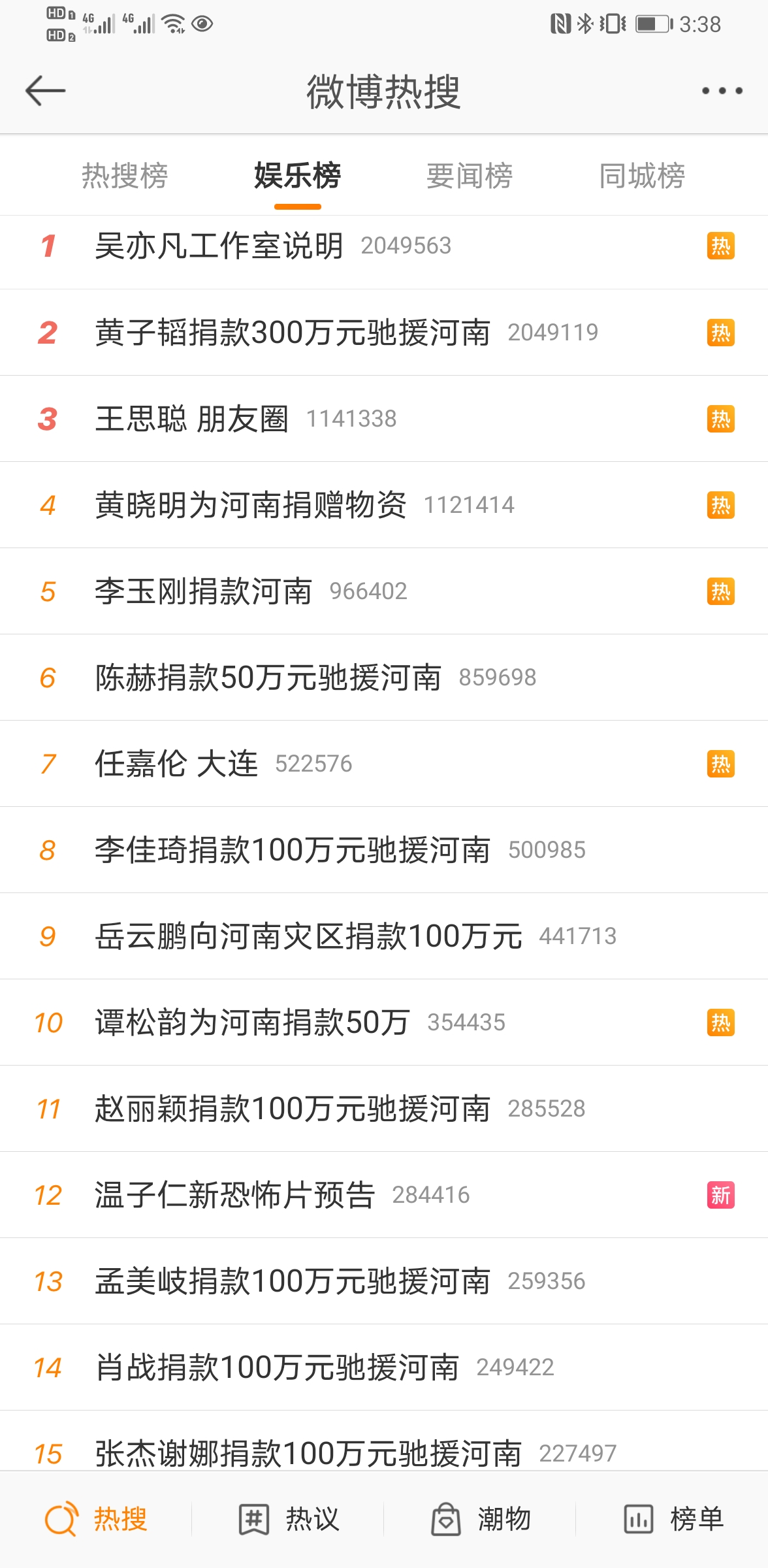 第二个就是王一博。作为河南籍艺人,这次灾情发生后,王一博也转发了一条消息为家乡加油,但后续跟进没那么积极,捐款也启动没那么快。但王一博粉丝后援会捐款比较积极,而又有网友质疑是王一博粉丝吐槽别的明星捐款100万太少,所以就期待王一博多捐款,炒得有点乌烟瘴气,让王一博的处境也比较难,期待王一博后续帮助家乡救灾的情况。