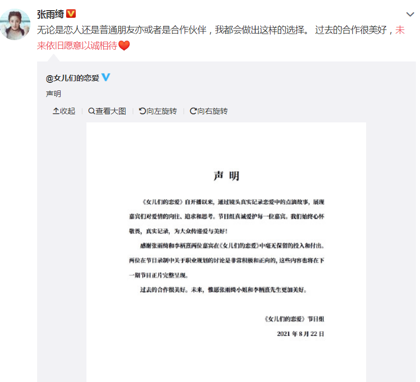 这样的操作,相信湖南卫视及芒果TV等平台,与长期合作的张雨绮、宁静等等明星,都见惯不惊,估计都没少使用,见惯不惊。但是这次张雨绮却因为芒果TV的真人秀《女儿们的恋爱》预告剪辑,与合作多年且很愉快的芒果TV撕破脸皮,像是一场带剧本真人秀的拆穿故事,折射了当下综艺圈的现状,甚至撕下了遮羞布。而这次芒果TV和张雨绮双方正面刚,看似实力悬殊,但双方都算老手了,难分输赢。