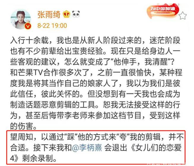 这些年湖南卫视和芒果TV的综艺节目,又多又火,赚得盆满钵满,也就请得起任何明星,不少人都靠着这些平台赚了不少钱,所以对湖南卫视和芒果TV总体上还是很敬畏。但是与此同时,这些很火的节目,也遭遇了不少观众的质疑甚至吐槽,其中焦点就是湖南卫视真人秀剧本套路设计痕迹明显,各种神仙甚至恶意剪辑,制造矛盾和看点进行炒作,不仅观众看不下去,有些拿钱参加节目的艺人,也曾有过抱怨和吐槽。只不过都不像这次张雨绮这样正面刚,直接在社交平台开撕,还宣布退出节目,完全能不留回旋余地。这算是芒果TV遇到的第一个,但恶意剪辑被吐槽不是第一次了。