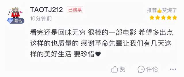 也有观众在看完后,还迟迟没有缓过劲来,表示这是一部回味无穷的电影,希望多出点这样质量的片子,感谢革命先辈让我们有今天这样的美好生活,我们一定要要珍惜。