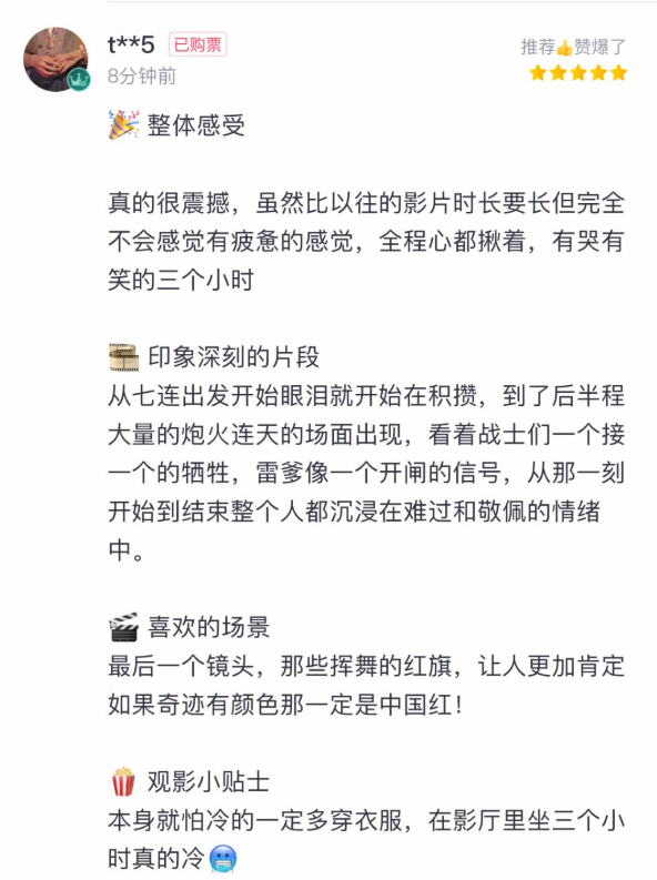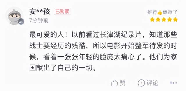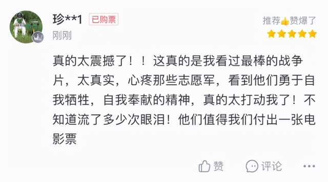 更有观众表示,自己之前看过关于抗美援朝的纪录片,知道“那些战士要经历的残酷,所以电影开始整军待发的时候,看着一张张年轻的脸庞太痛心了。他们为家国献出了自己的一切。”