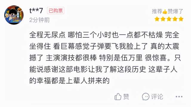 有观众觉得,《长津湖》作为一部战争片,全程无尿点,哪怕三个小时也一点都不枯燥完全坐得住。看巨幕感觉子弹要飞他脸上了,真的太震撼了。主演演技都很棒,特别是伍万里很惊喜。只能说感谢这部电影让我了解这段历史这辈子人的幸福都是上辈人拼来的。