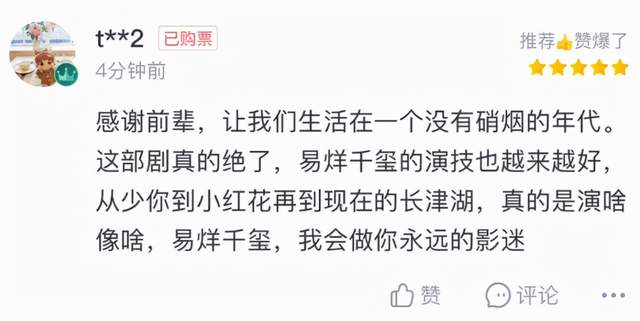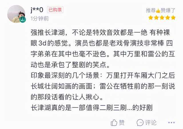 更有人说,强推长津湖,不论是特效音效都是一绝有种裸眼3d的感觉,演员也都是老戏骨演技非常棒,易烊千玺在其中也毫不逊色。其中万里和雷公的互动也是承包了整剧的笑点。万里打开车厢大门之后长城壮阔如画的画面真美……长津湖真的是一部值得二刷三刷的好电影。