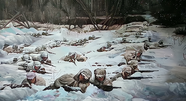 从初入朝鲜的轰炸机群到长津湖血战时横尸遍地,导演全程没有回避美军装备的压倒性优势。吴京饰演的连长伍千里,连中不论是“雷公”还是“神枪手”,看似人才济济,正面对决的时候,面对压倒性的装备优势,一个个也只能用短枪细炮寻找机会,可惜除了一腔孤勇,他们只比美军多出一轮零下四十度的寒冬。而这就是当年入朝作战的中国军队面临的真实状况,历史上的长津湖战役中,伍千里所在的九兵团战斗伤亡19000余人,冻死冻伤的人数却达到了可怕的28000余人,影片中多次出现的画面,深刻还原了这一史实。