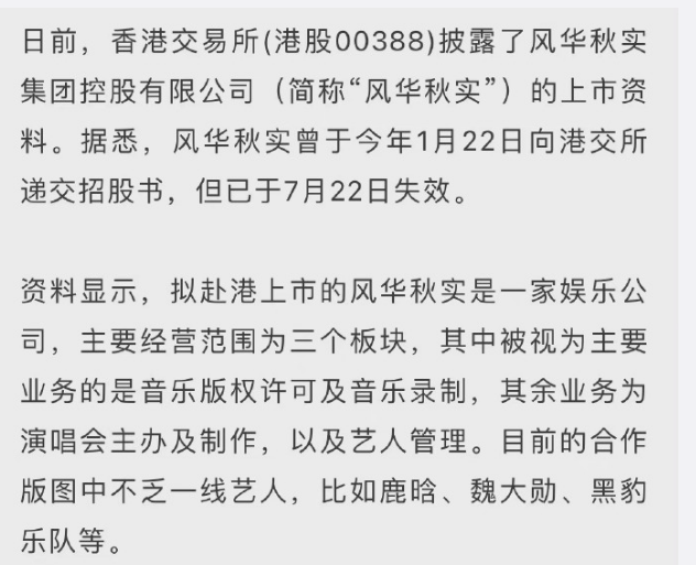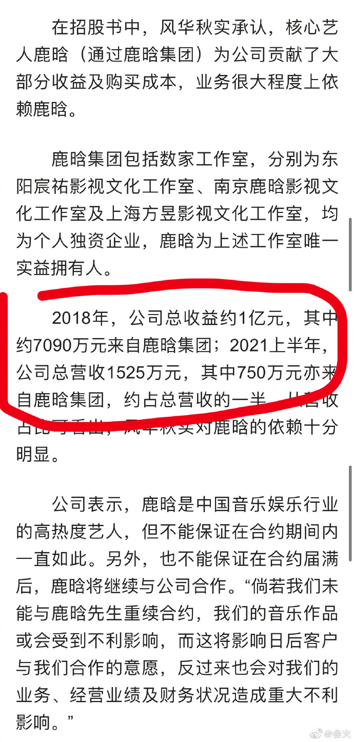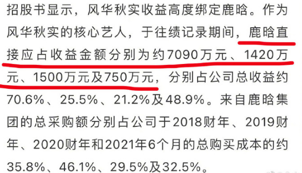 鹿晗所在的风华秋实向港交所提交了招股说明书,拟赴港IPO,招股书中显示,公司收入依赖其所管理的核心艺人鹿晗。2018年,公司总收益约1亿元,其中约7090万元来自鹿晗集团;2019年,公司总收益约1420万元来自鹿晗集团;2020年,公司总收益约1500万元来自鹿晗集团;2021上半年,公司总营收1525万元,其中750万元亦来自鹿晗集团,约占总营收的一半。