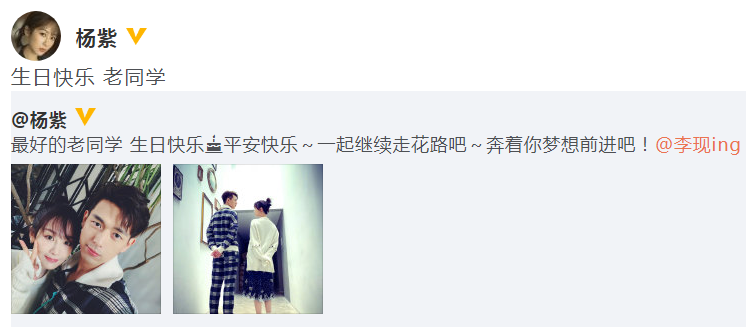 倒是老搭档老同学杨紫准时为他送上生日祝福,两人是同学校友,最近三年因为合作,坚持为彼此庆生,关系从同学升级为搭档,更值得珍惜。