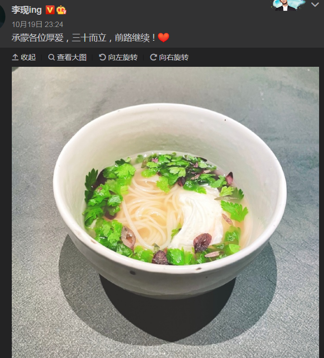 所以李现也算在三十岁之前事业有成,步入三十岁,也算是新的起点。李现过生日比较低调,没有太多感慨,一碗面条,传统又实在,没有沸沸扬扬的粉丝应援,也没太多娱乐圈好友互动。