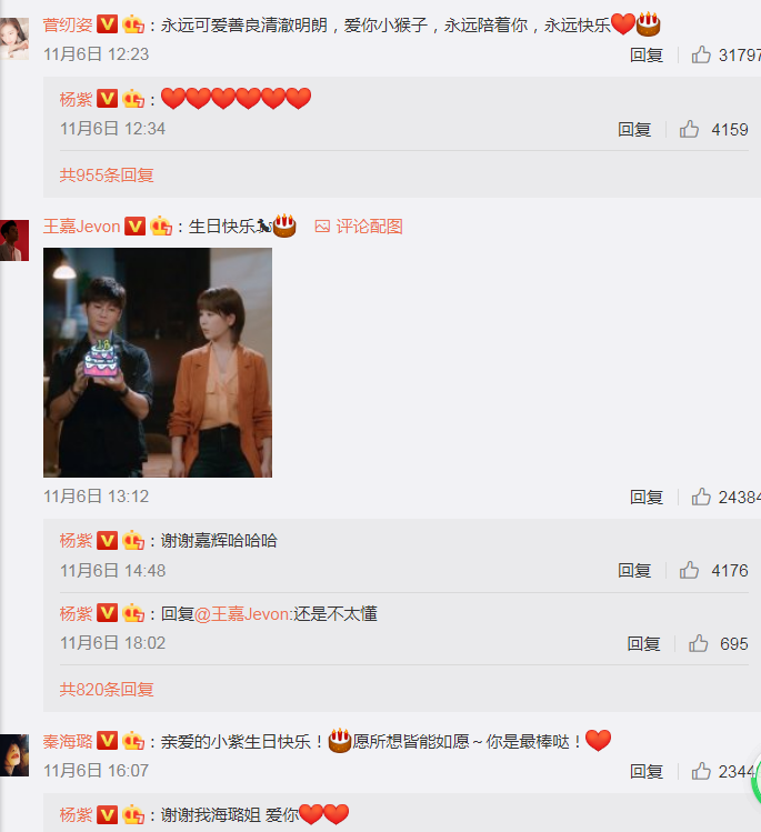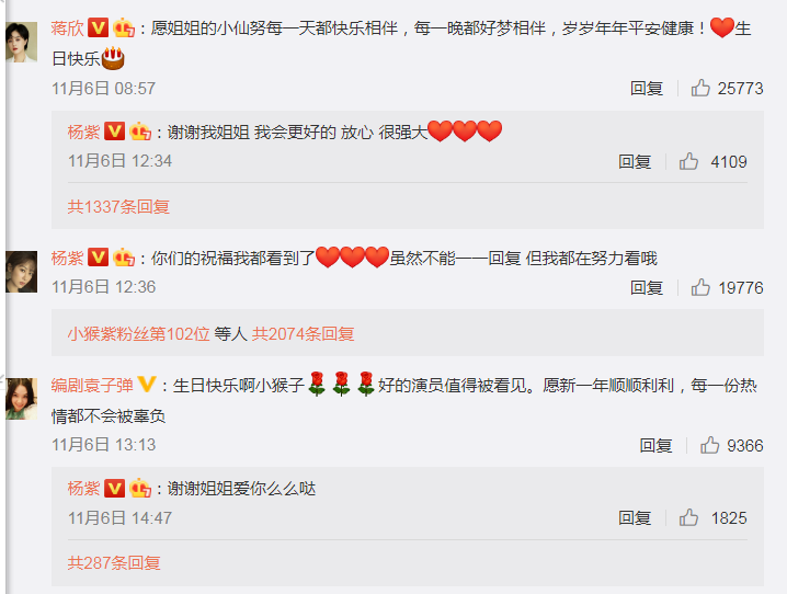 所以最近好些当红明星和流量明星过生日,微博上都比较低调,除了粉丝祝福,明星互动都不多,不过杨紫是个例外。