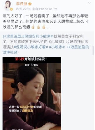 而同样是在影视圈发展多年的专业演员薛佳凝,在看完这部剧的这段戏后,也是忍不住大呼周迅的演技高级,表示佩服!看来周迅的演技不仅征服了粉丝和普通观众,更是征服了业界的导演和演员同行。