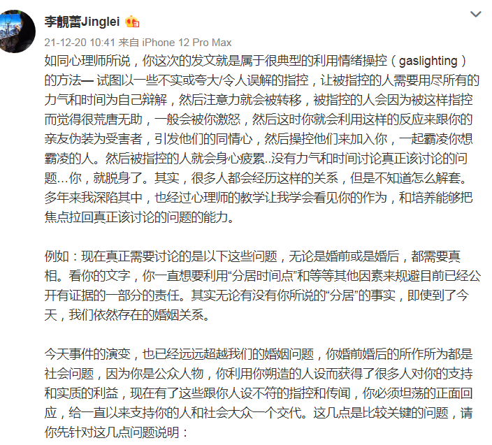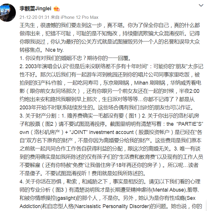 于是李靓蕾彻底被激怒,在王力宏深夜发文后,她也熬夜发文驳斥王力宏的说法,然后早上再追加一篇长文。