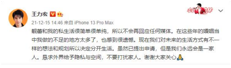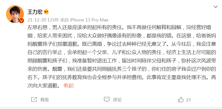 首先,这次王力宏没有各种否认辩驳,算是正式给李靓蕾以及家人子女和公众道歉了,这是大家需要看到的态度。至于私下的真相,王力宏还有多少辩驳甚至委屈,已经不那么重要了。