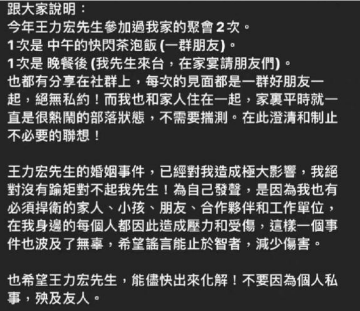 但是,这次离婚大战爆发后,徐若瑄受到波及,反应很强烈,多次发言辟谣,要撇清关系自救。在第一次自己发言效果不佳之后,徐若瑄再次发言,却将矛头指向王力宏,让他出来帮她撇清。