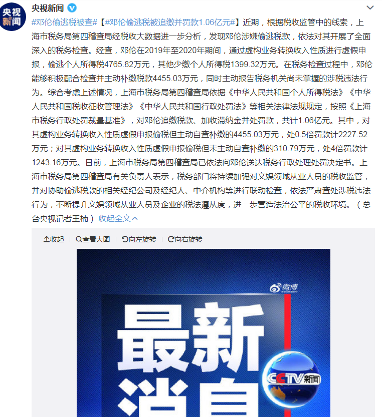 所以邓伦突然在2022年3月15日这天被曝光税务问题,经查,邓伦在2019年至2020年期间,通过虚构业务转换收入性质进行虚假申报,偷逃个人所得税4765.82万元,其他少缴个人所得税1399.32万元。在税务检查过程中,邓伦能够积极配合检查并主动补缴税款4455.03万元,同时主动报告税务机关尚未掌握的涉税违法行为。综合考虑上述情况,税务部门对邓伦追缴税款、加收滞纳金并处罚款,共计1.06亿元。这个新闻让人意外,也并不意外。