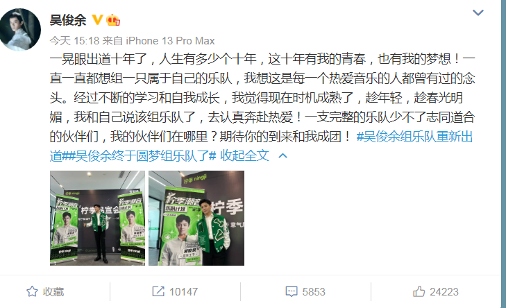 没想到最近这个昔日快男吴俊余,发文表示自己想要解锁新身份,组建一支属于自己的乐队,并在线邀约志同道合的乐手一起实现梦想。虽然出道就算玩音乐,这些年也在坚持,但天赋和积累不够,所以觉得这些年学习积累成长,觉得时机成熟了,所以想组乐队重新出道。