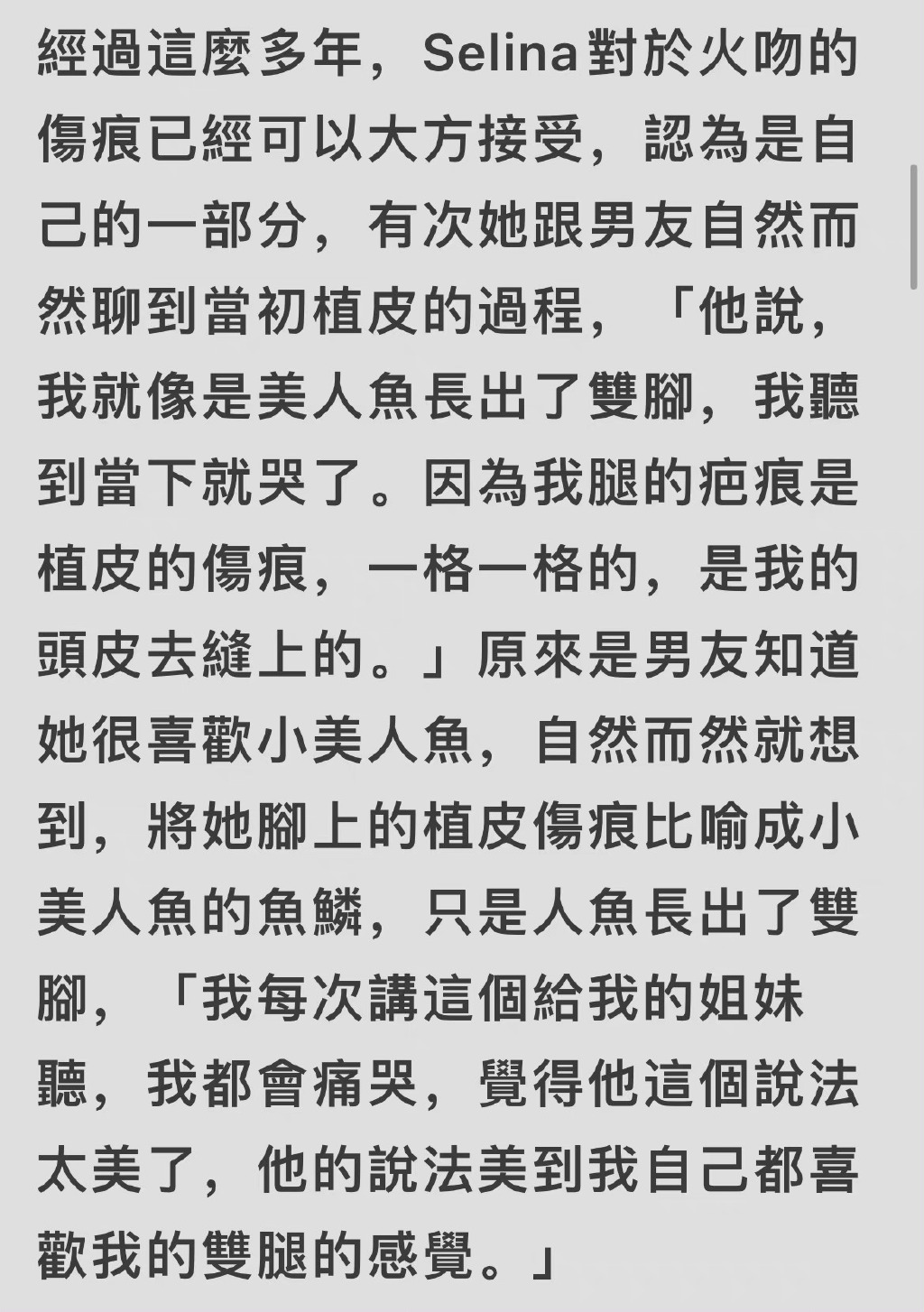 比如Selina近日受访谈到,有次她跟男友自然而然聊到当初植皮的过程,男友居然夸她像是美人鱼长出了双脚,植皮的地方像美人鱼的鱼鳞,她迅速就被感动了。而且Selina每次和姐妹们讲这件事,都会自我感动到哭。