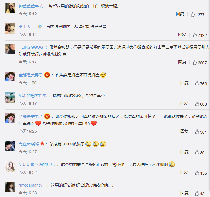 对于这件事,一部分网友也像Selina一样被感动,但还是有不少网友劝诫Selina不要爆料炒作过多,免得以后打脸,还有人质疑这个小男友嘴巴太甜,太会哄女友,看似是强项,但也怕这是双刃剑,哄多了担心以后就是真的哄人和骗人了。但愿网友的关心和质疑是多余,也希望Selina低调处理新恋情,避免太多招摇给彼此增加压力。