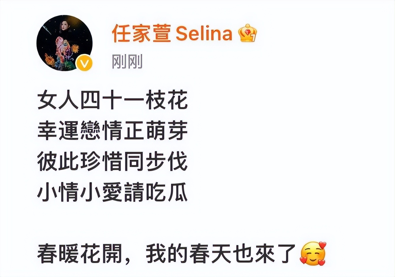 另一方面,离婚单身有一段时间的Selina,虽然之前上恋爱真人秀炒作过绯闻,结果还只是逢场作戏,节目结束了就无果而终,又单身了几年,现在终于在年满四十之后,还迎来新的恋情,自然也被关注和祝福。