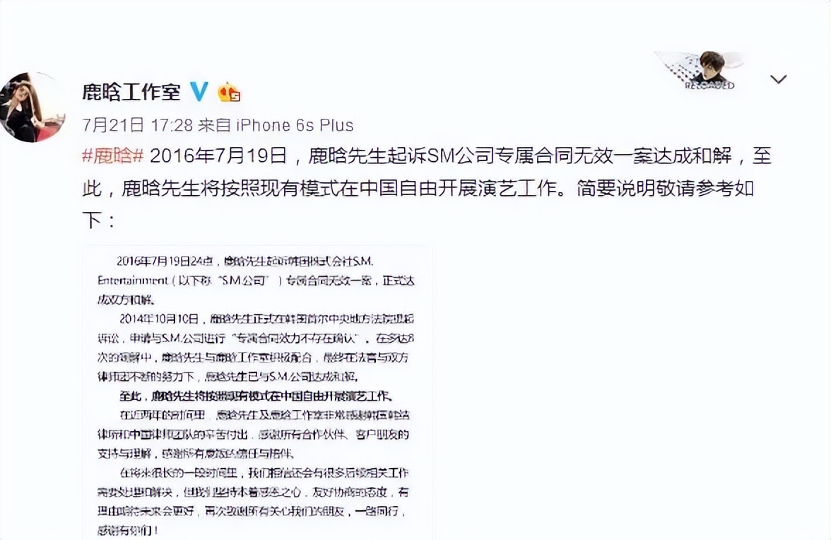 虽然鹿晗曾经也是作为练习生签约SM娱乐公司,也在这里出道走红。但是早在2014年10月10日,因公司无法提供未来发展计划、身体在高强度工作和压力下出现病症等原因,鹿晗申请与韩国SM娱乐有限公司的合同无效,并于2016年7月19日达成和解。后来鹿晗的发展也还算顺利,如今算来也是解约了七年多快八年了。