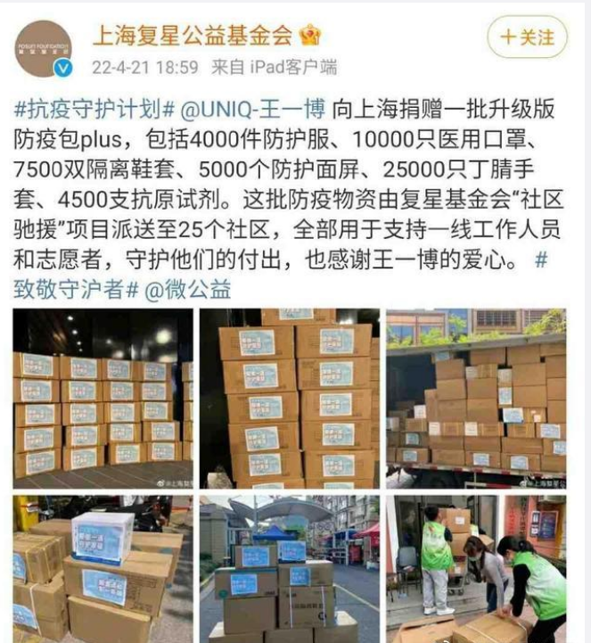 另一条就是一向热心公益慈善的王一博,最近和好些明星一样,为上海疫情献出爱心驰援上海,捐赠的各种生活物资以及医用物资。