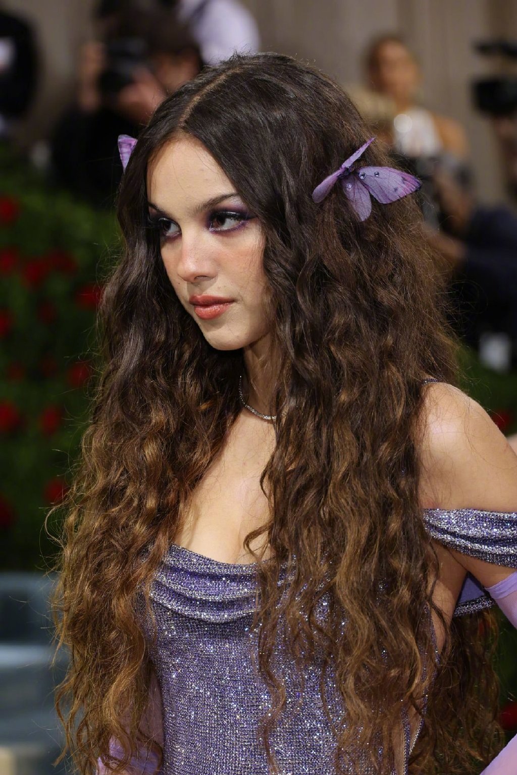 Olivia Rodrigo蝴蝶歌姬造型相当性感流畅,礼服华美凸显身材,头上两颗蝴蝶发夹锦上添花。