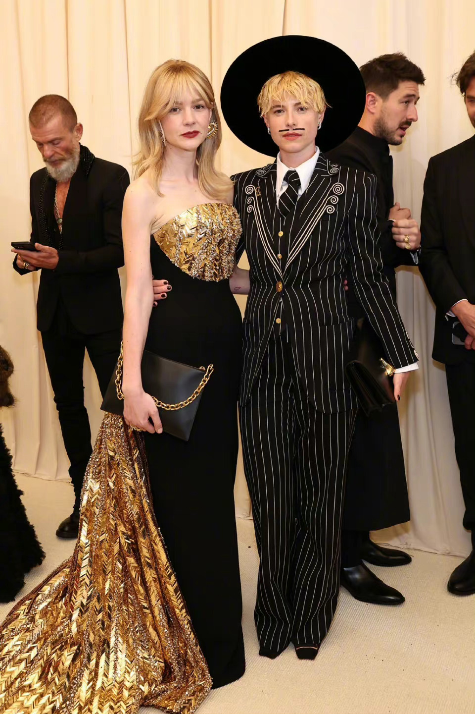 凯瑞·穆里根和杰西·巴克利亮相纽约大都会艺术博物馆慈善舞会 - 镀金魅力红毯,杰西画了胡子,好可爱。凯瑞·穆里根裙子虽然整体不仅简约,但是抹胸和裙摆首尾呼应,非常亮相,很像孔雀或者凤凰,低调却不朴素。