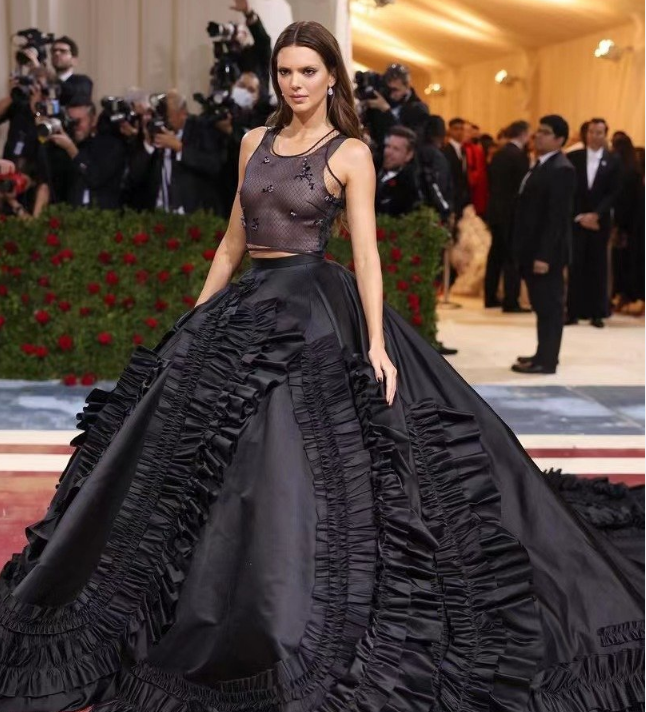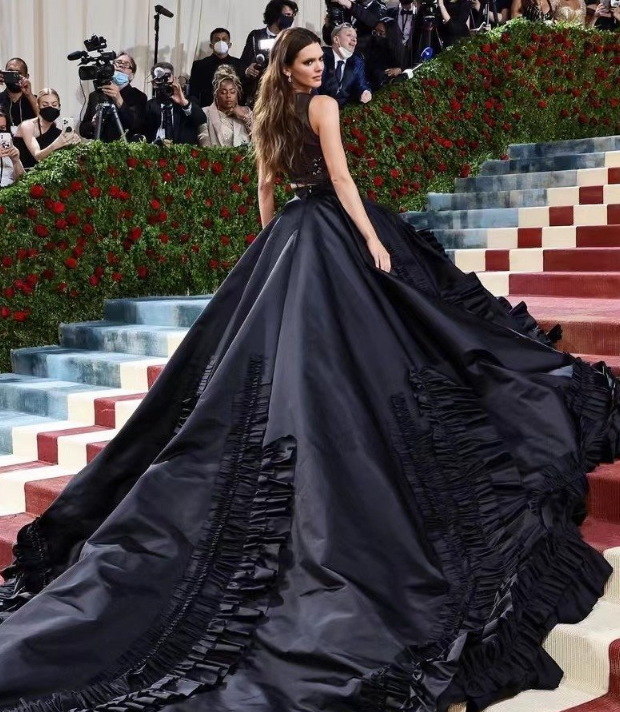 她一袭 PARDA 黑色长裙亮相Met Gala 2022 红毯,肯豆还将眉毛漂白,冷艳公主气质已上线。她的礼服虽然颜色低调,但是上面极其简约性感,下摆相当豪华,整体的设计感和视觉冲击不差。