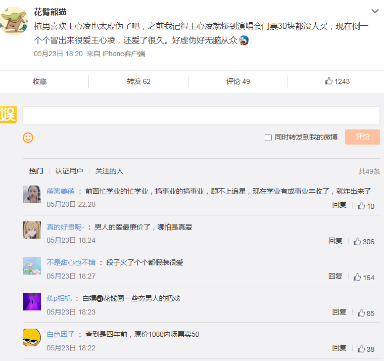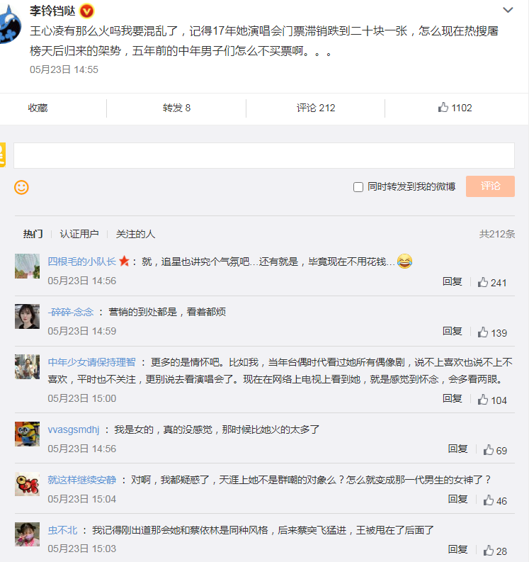 而且其实王心凌曾经火了之后,陷入了很长一段时间的低迷期,当时人气并不旺盛,好像也没多少粉丝付诸行动为偶像买单,根据网络爆料,就在前几年,王心凌开演唱会,不仅一度门票卖不出去,后来价格从一千多跌至几十块,都无人买单,这个反差大到让人意外。所以在王心凌翻红,很多粉丝在网上应援的同时,很多人质疑王心凌的粉丝真的那么多那么真心吗,就唱了一首老歌,就能迅速翻红成这样,那之前那么多过气的歌手,是不是都能如此轻松收获这个待遇呢?
